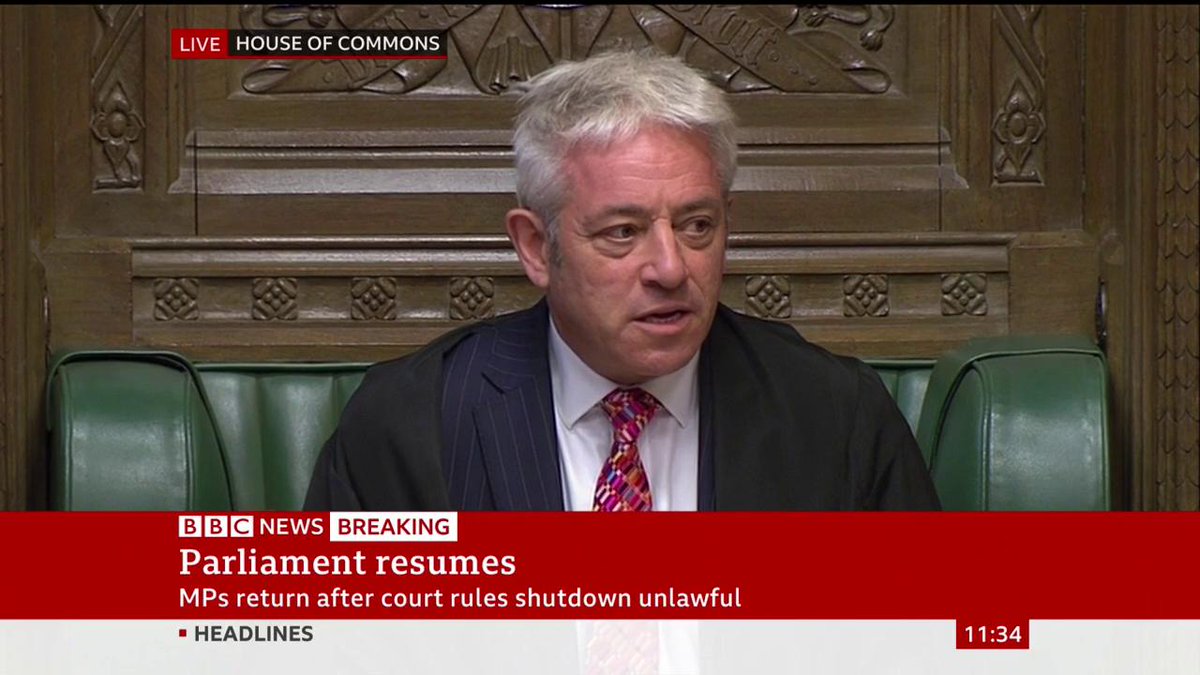 "Colleagues, welcome back to our place of work" Commons Speaker John Bercow addresses MPs as they return to Parliament, after the Supreme Court ruling that its suspension was unlawful